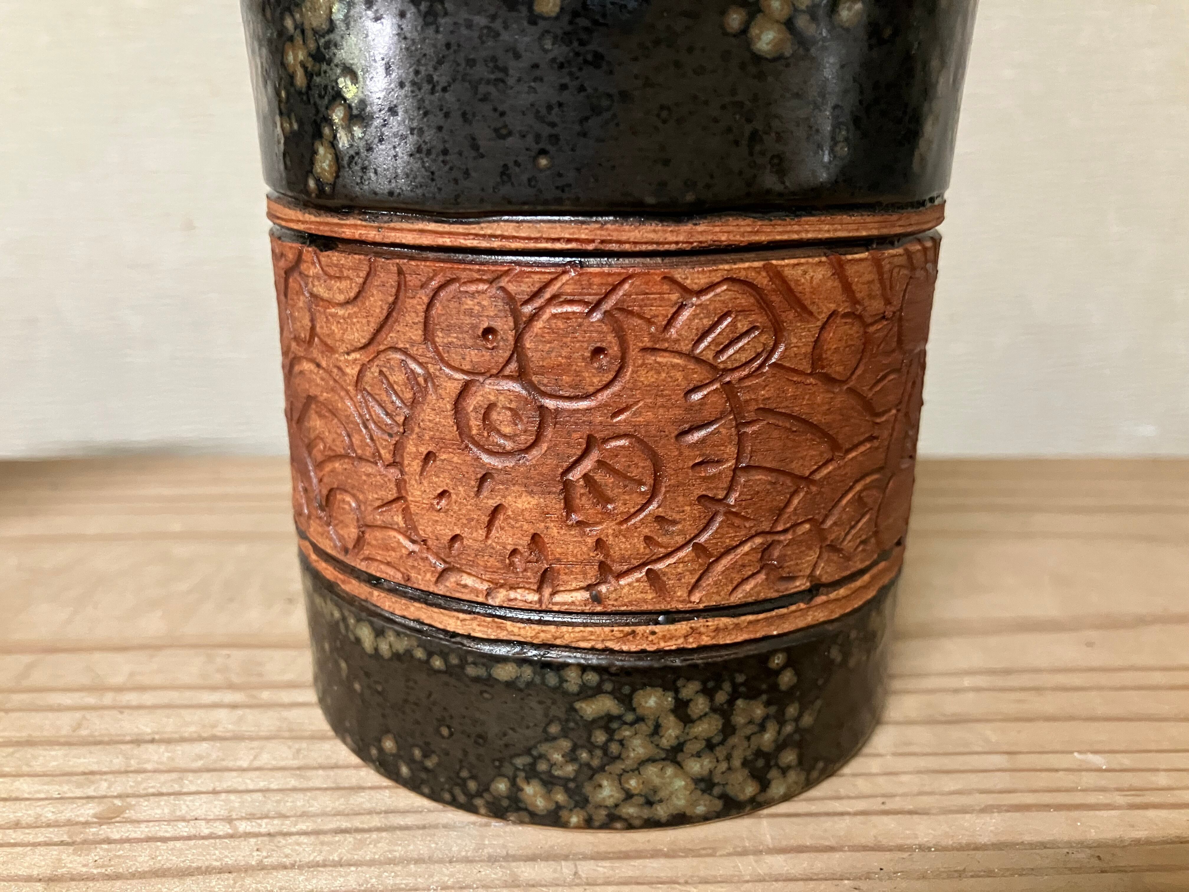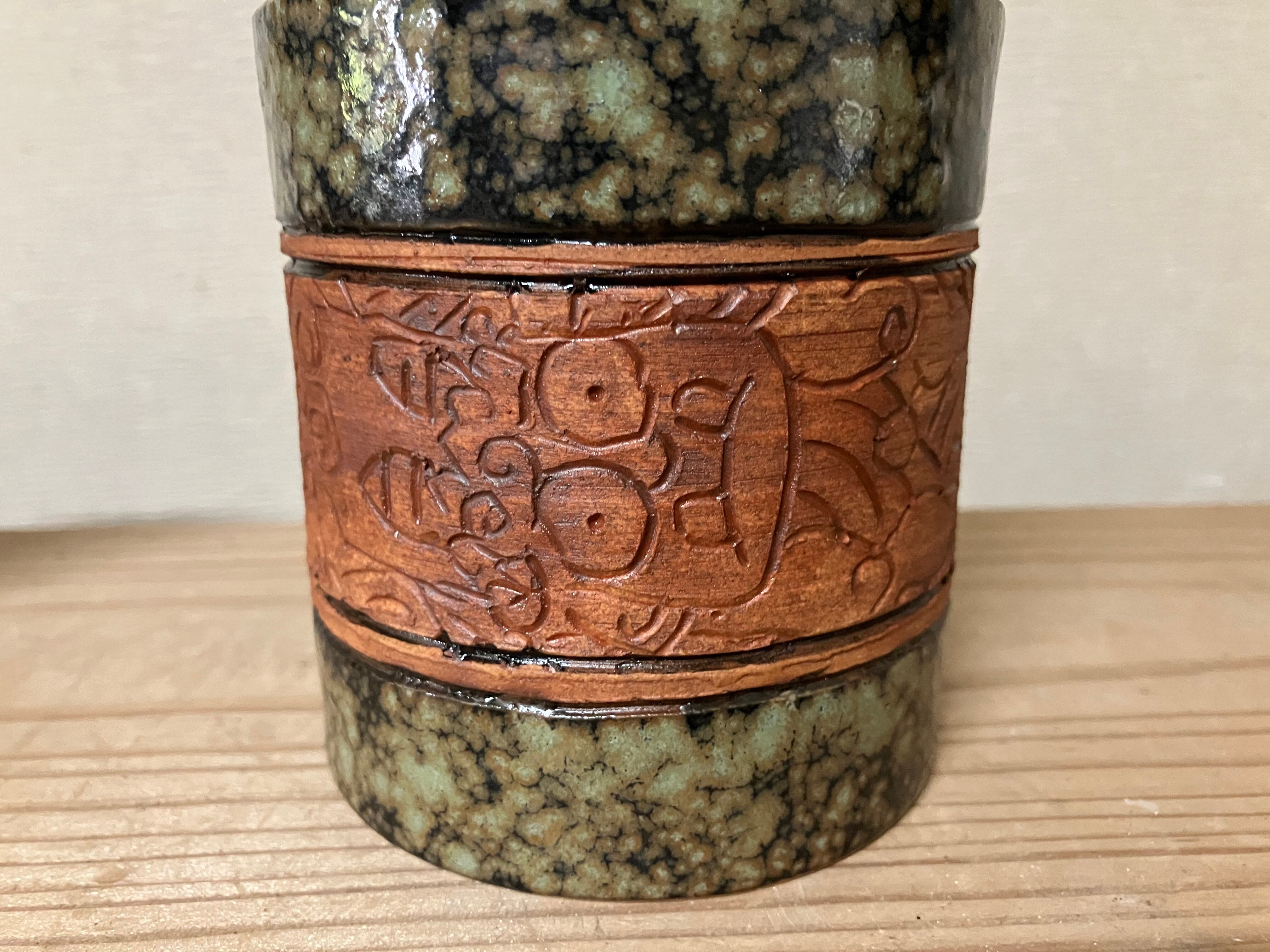 焼成によって変化する窯変釉薬を施釉しています。朱塗の部分は釉薬はかけずに柄を彫り込んでいて手間がかかっています。