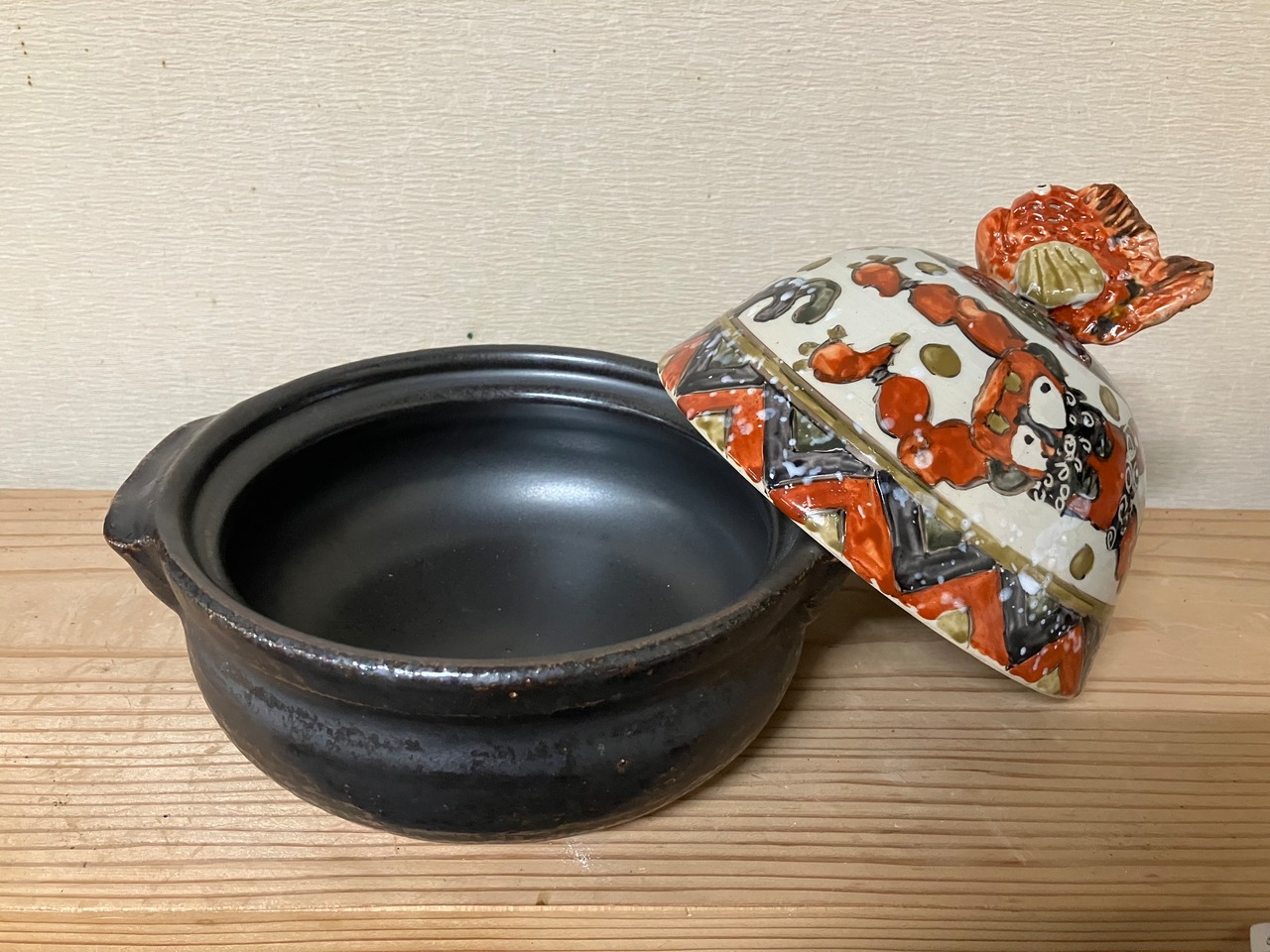 一人用鍋として、またご飯土鍋にいかがでしょう。土鍋自体はシンプルですが 帽子のような形のにぎやかな蓋で食卓が華やぎそうです。