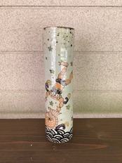 パステル調のやさしい色合いの鬼と魚たちが青海波で舞い踊る花瓶。